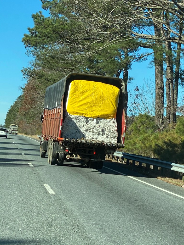 Driving through the south and looking out the window onto the cotton fields takes me back to the old “Southern” movies but then we get behind a truck with bales of cotton, being transported somewhere, and the only implication that the south endures.