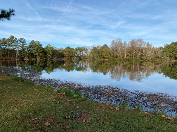 After a first night on our Murphy Bed in the camper, we decided we need more padding, not on us but on the bed. But that is not the worst of the morning…we discovered a small puddle of water by the door. It looked like condensation leaking through the side of the door. The new coffee maker worked well and we watched our CBS Morning News which we accessed through the antenna. Off we drove from Davis Lakes, Suffox, Virginia headed to Bass Lakes, Dillon, NC, a 257 mile drive.