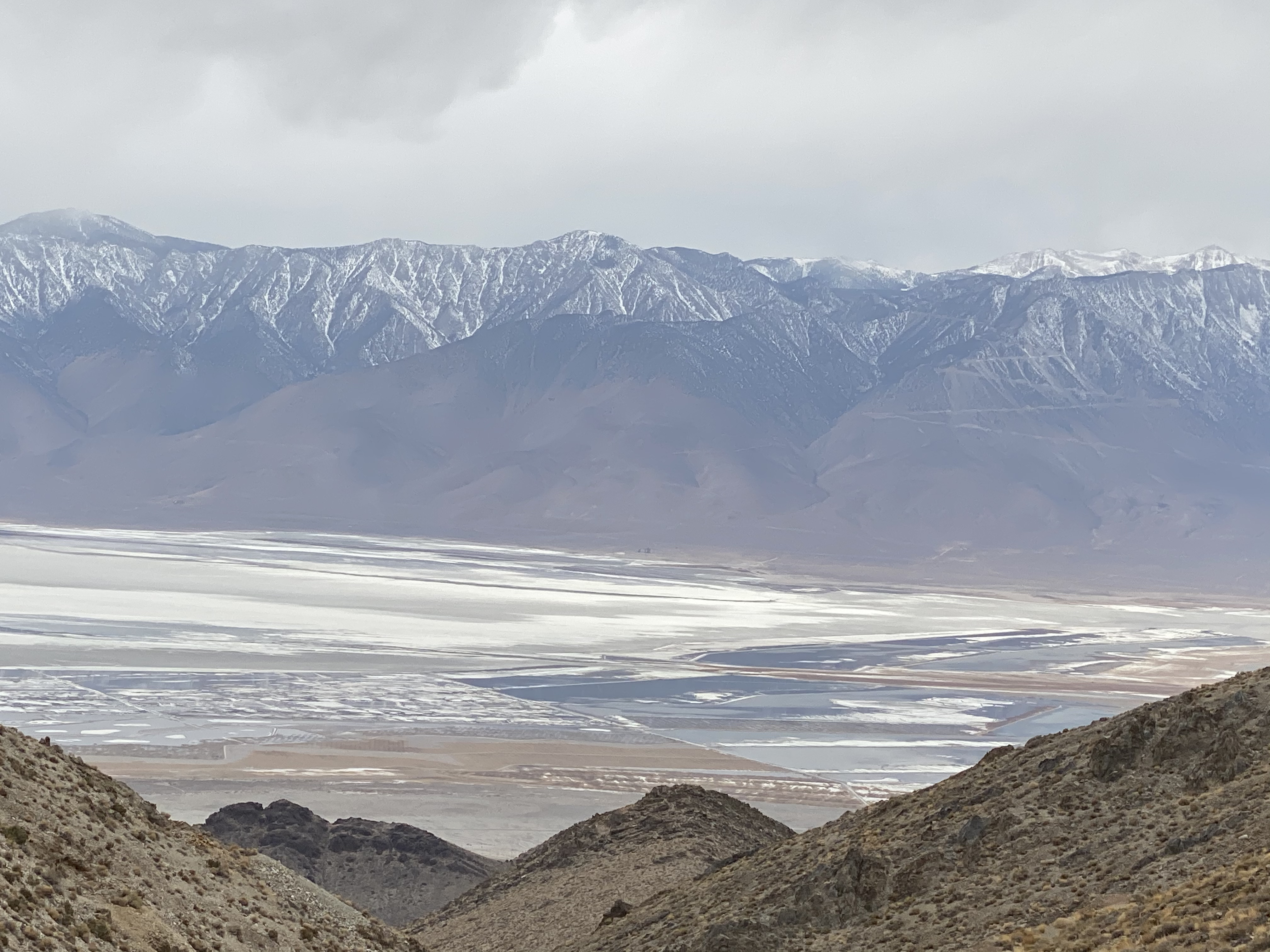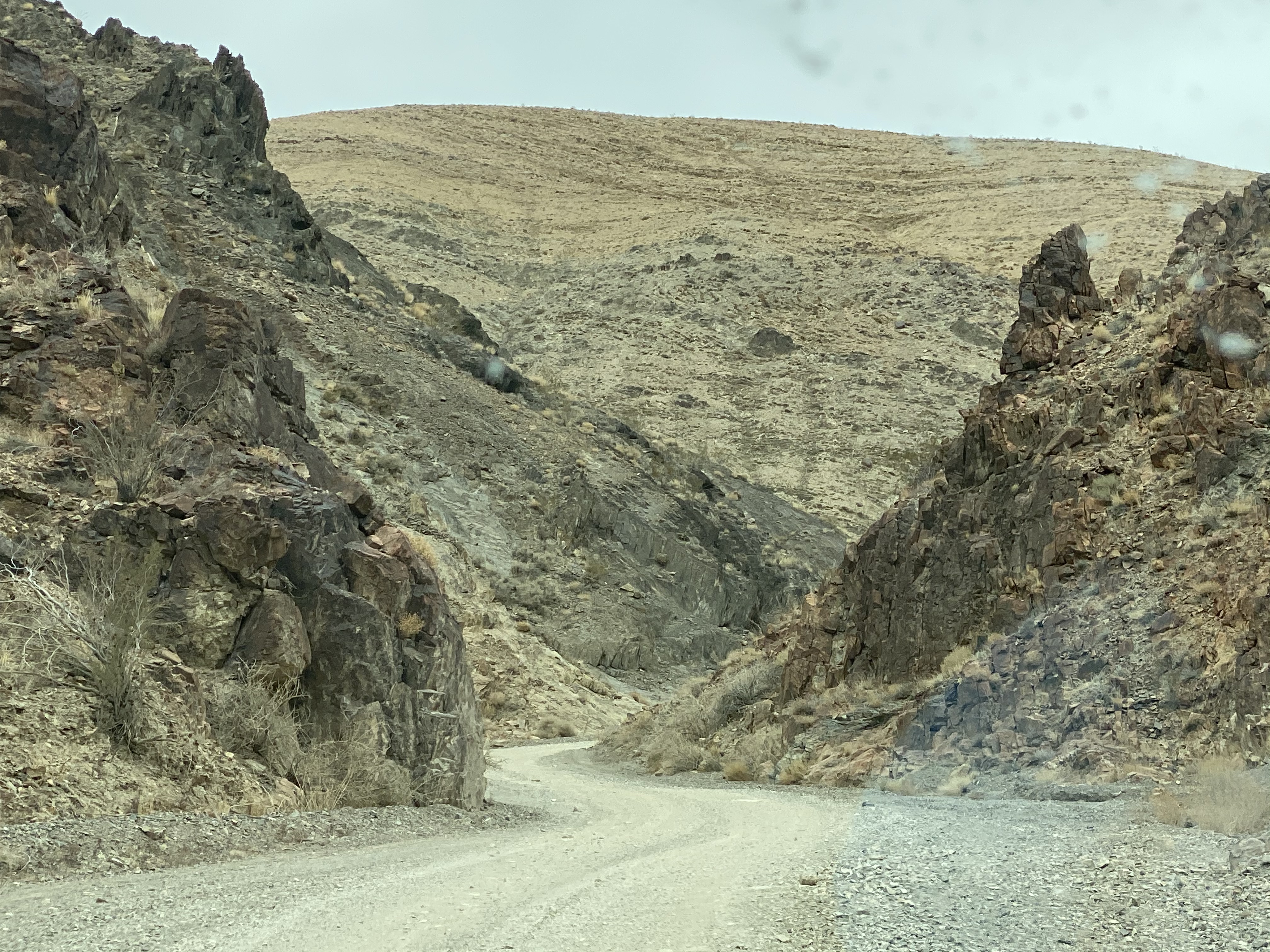 We immediately found ourselves on a dirt, rock filled road with deep ruts. This winding path, known as Yellow Grade Road, consists mainly of switch backs, cutting through juts of rock and sand. The snowy Inyo Mountains rises over Owens Lake, impressive and regal!