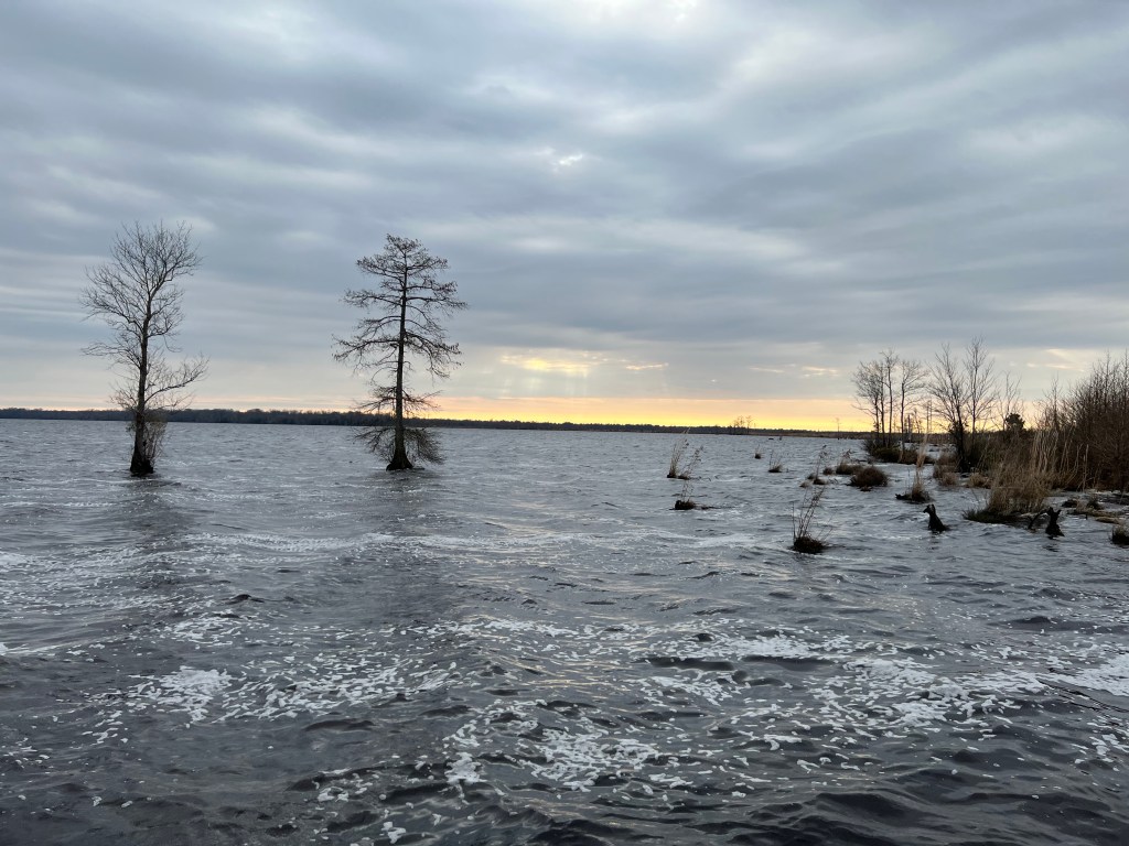 Lake Drummond is 3100 acres and the largest natural lake in Virginia, formed 4000 years ago as a result of a severe that burned away feet of peat soil. The water is a dark brown color as a result of the ground water perking like coffee through the peat soil. The winds of the day created white (really brown) caps and waves. There are canals through the Dismal Swamp canals flowing from the lake, along the eastern boundary of the refuge.
