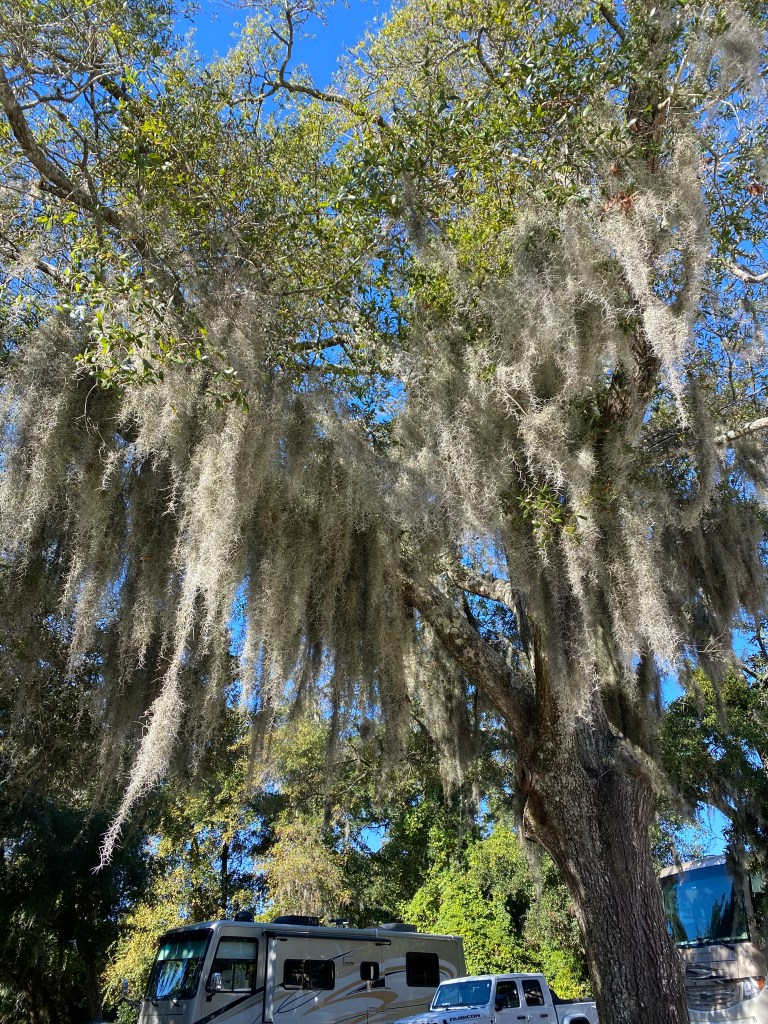 Some travel days are just that, all about travel. We drove from Charleston, SC to Jacksonville, GA, a trip of 219 miles. The most interesting sight was the Spanish Moss, really a flowering plant that grows on large trees in a subtropical climate in this case. It is considered native in the Southern United States.