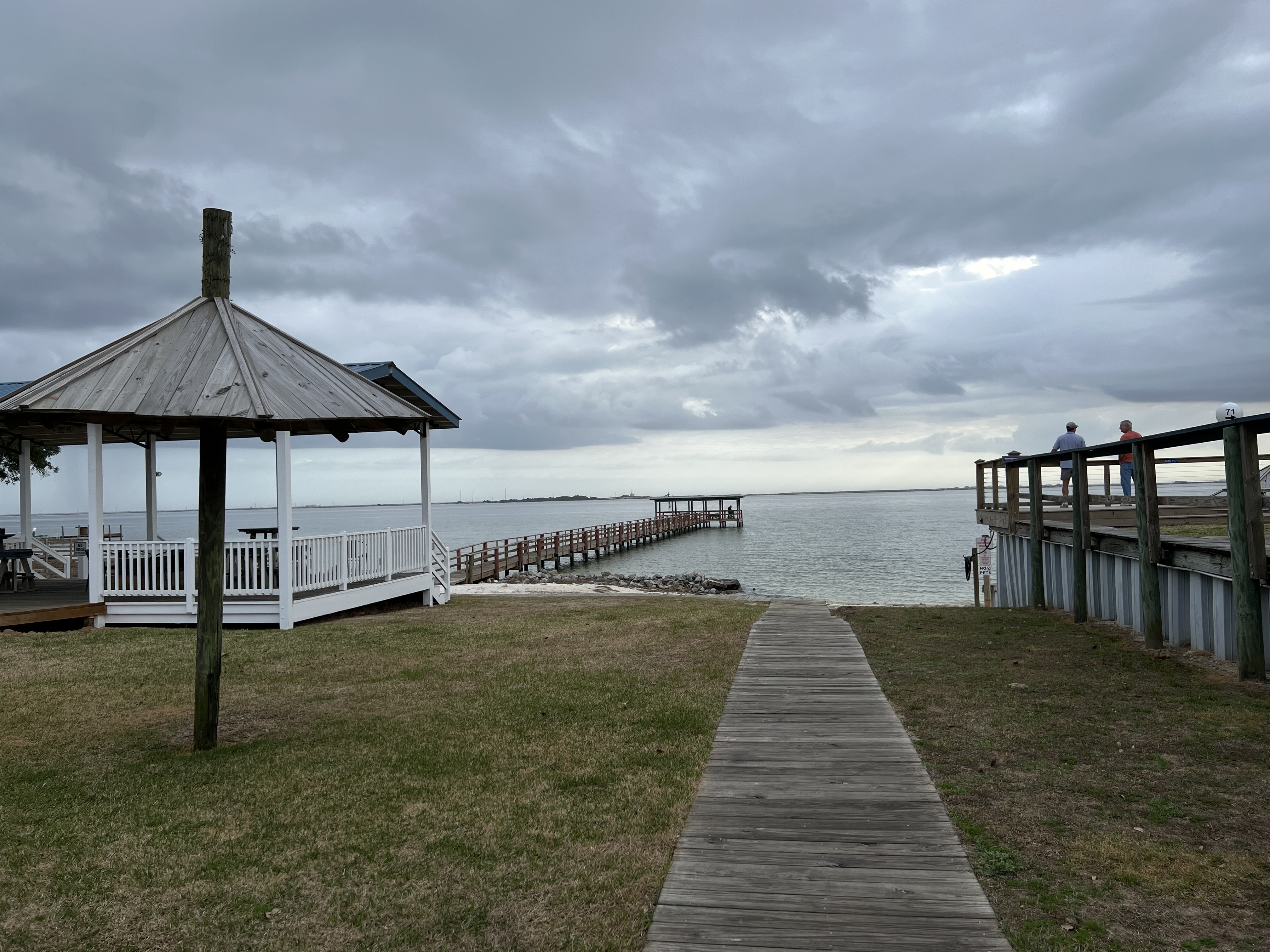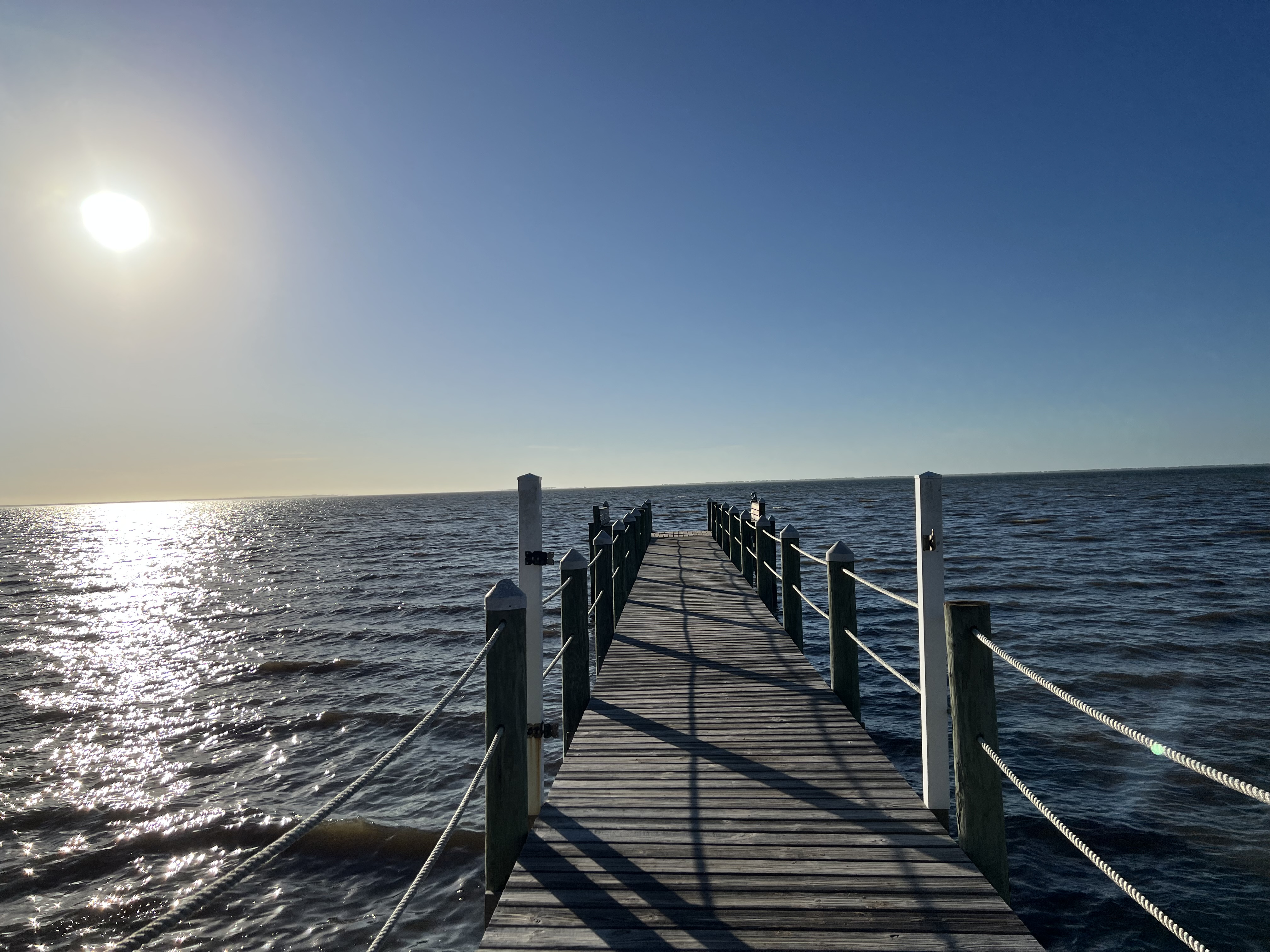 Florida is both long and narrow, and has a panhandle. Today we start to move west at long last on our 2023 journey. Starting this morning the view from the pier of the campsite in Apalachiacola was lovely, bright and engaging.