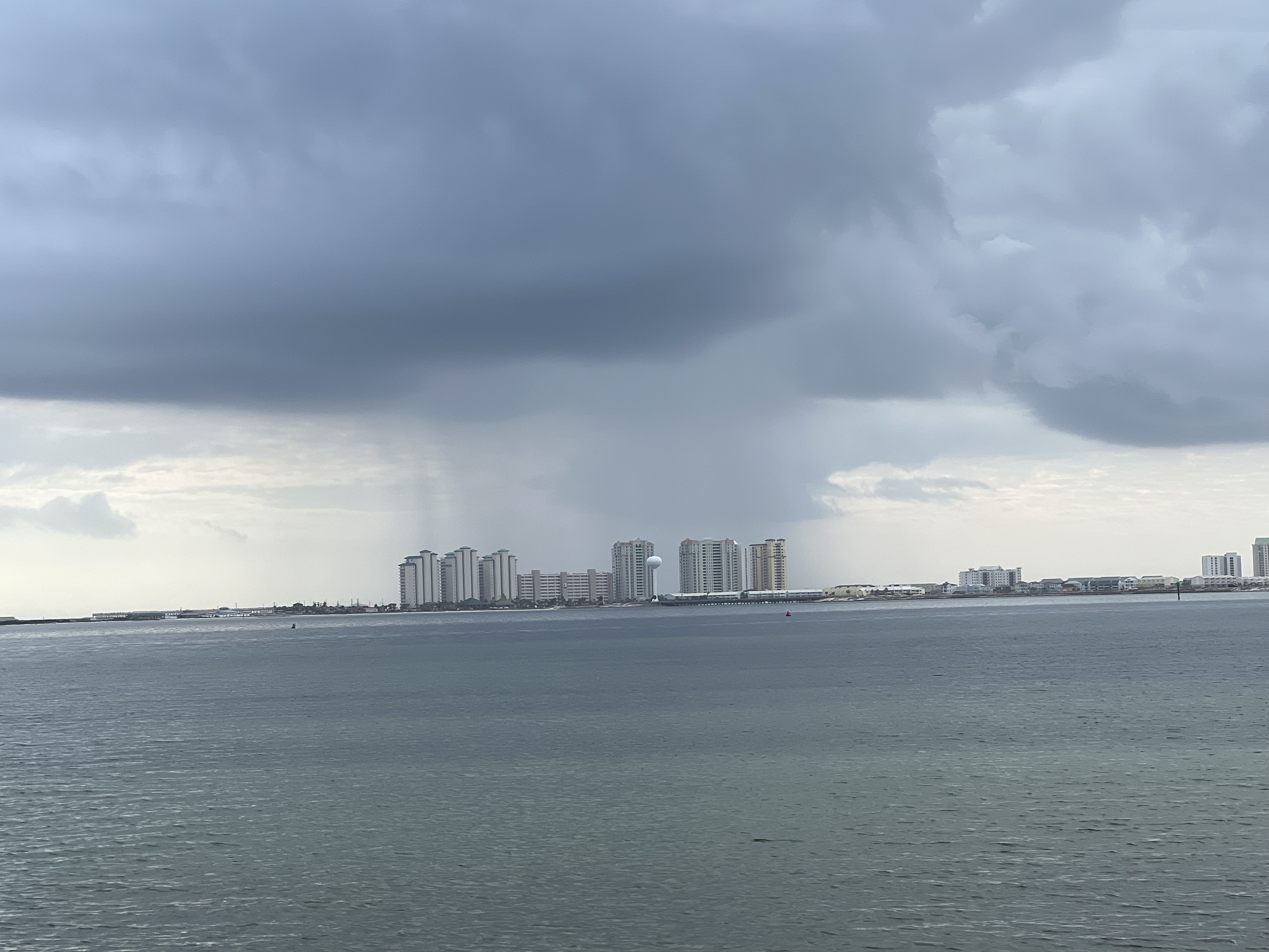 As we traveled west. the time changed to Central Time Zone so gaining an hour of daylight at the day’s destination was a benefit. The arrival in Navarre, FL, at the Emerald Beach RV park is always pleasant with panoramic views of the water and city skyline. The temperatures are mild but while the day was not sunny, it was impressive with clouds crossing the skyline.